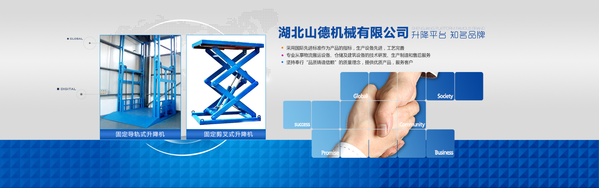 湖北山德機械有限公司始創于2009年是生產液壓機械的專業公司,公司堅持“誠信為本,服務至上,永遠承諾用戶需求”的原則,經過我們多年不懈的努力,現在已經發展成為華中地區專業的液壓升降機的生產銷售服務型企業之一,公司在經營過程中和合作廠商緊密聯系,不斷推出高質優價的產品,為用戶提供一站式服務,不斷完善產品類型和產品質量,依靠強大的銷售網絡與優良的售后服務贏得了廣大用戶的信賴與支持。 公司經營范圍:固定式升降機 移動升降機 液壓登車橋等液壓升降設備。 公司承諾:若出現產品質量問題,不論質保期內還是保期外,凡購買我公司所經營的產品,都將享受終身維修服務,歡迎廣大客戶和廠商來電咨詢!